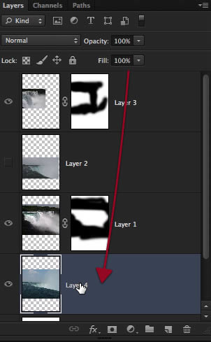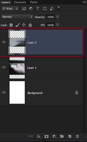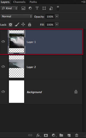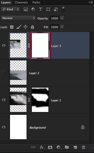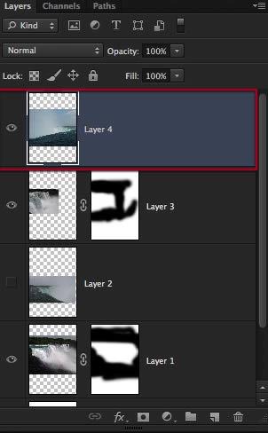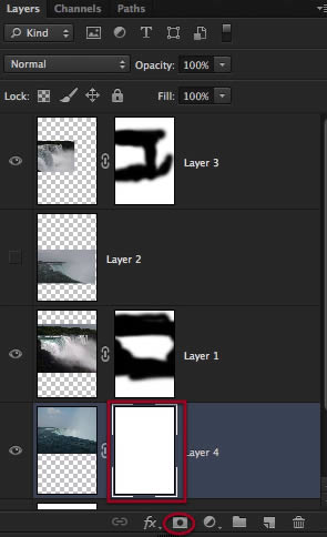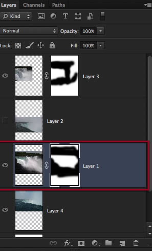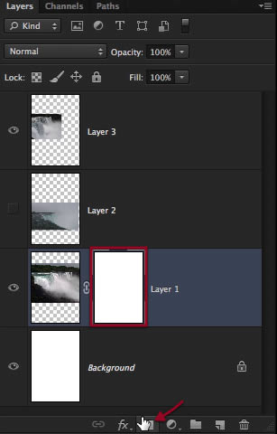 Perfect, so now we have these three layers of waterfalls to work with, let’s go to the bottom one and make a layer mask for it. Also to see things better you can hide or disable the other layers on top.