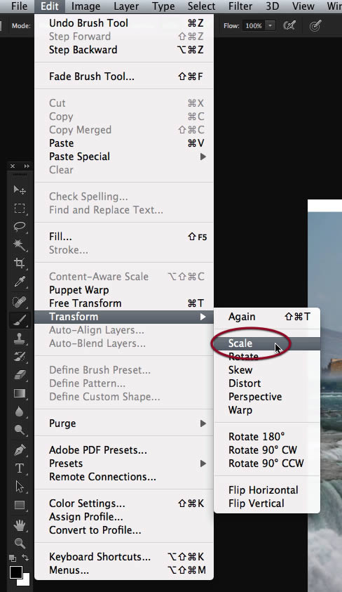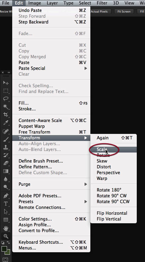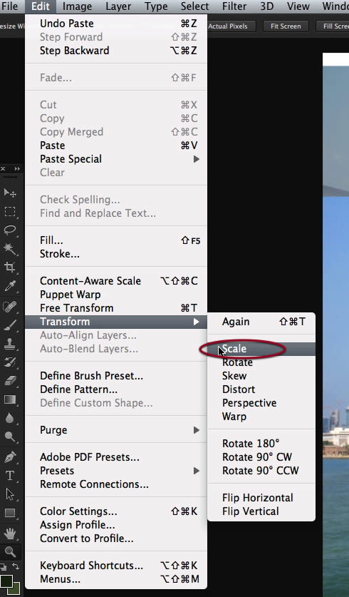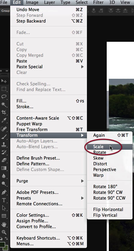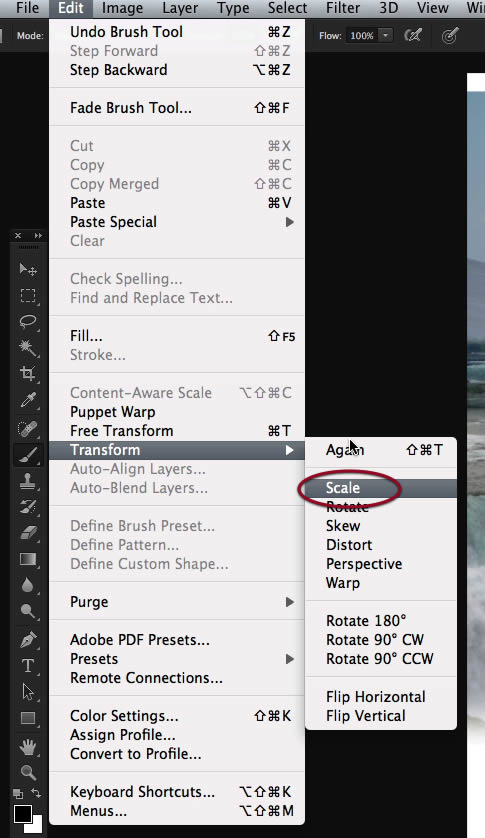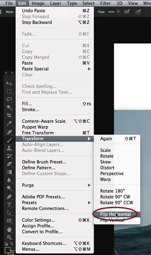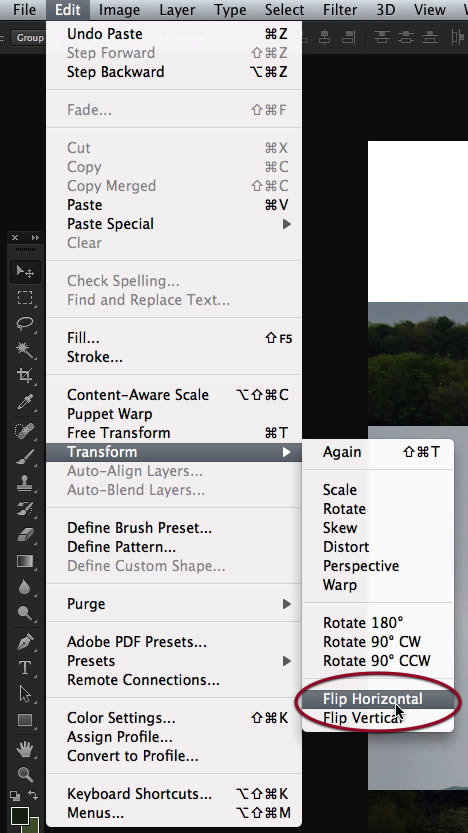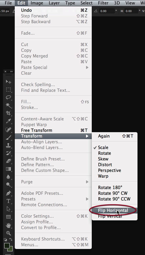 We need to flip it horizontally, so access that command on the edit menu.
